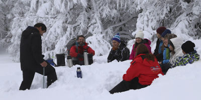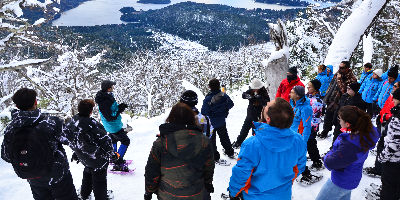 Nos dirigimos al cerro López donde realizaremos un trayecto por la montaña en vehículos 4x4, luego de unos 20 minutos comenzamos una caminata con raquetas de nieve, de una hora aproximadamente, donde las vistas sobre el lago nos impactarán. Contamos con dos horarios de salida, uno por la mañana y otro a partir de la tarde. En el primer horario al llegar al refugio lo esperamos con una fondeau de queso disfrutando de excelente vistas y paisajes nevados. Si es por la tarde lo vamos a esperar con una fondeau de chocolate invitándolo a disfrutar del atardecer desde la montaña.